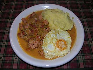 Hauptgericht: Fleischkäse-Ragout mit Spiegelei